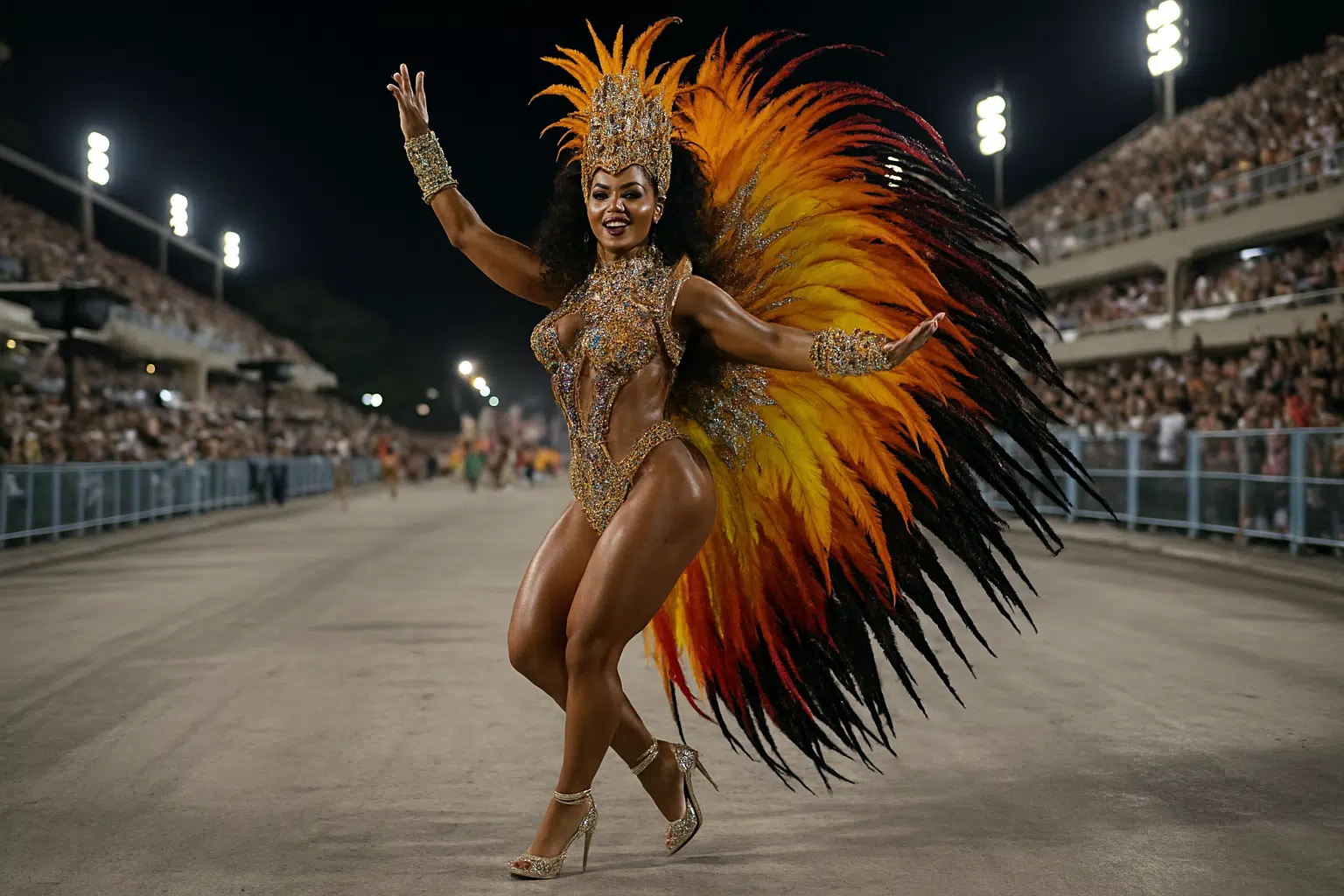 Passista de samba com fantasia de plumas coloridas desfilando no Carnaval.