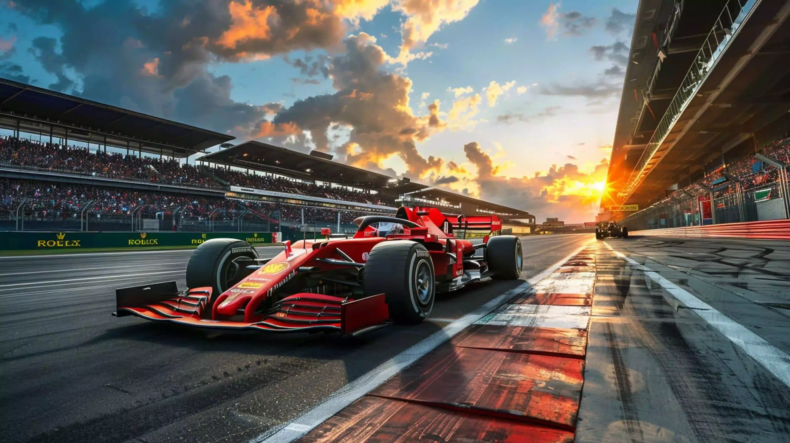 Carro vermelho de Fórmula 1 acelera na pista ao pôr do sol com arquibancada lotada