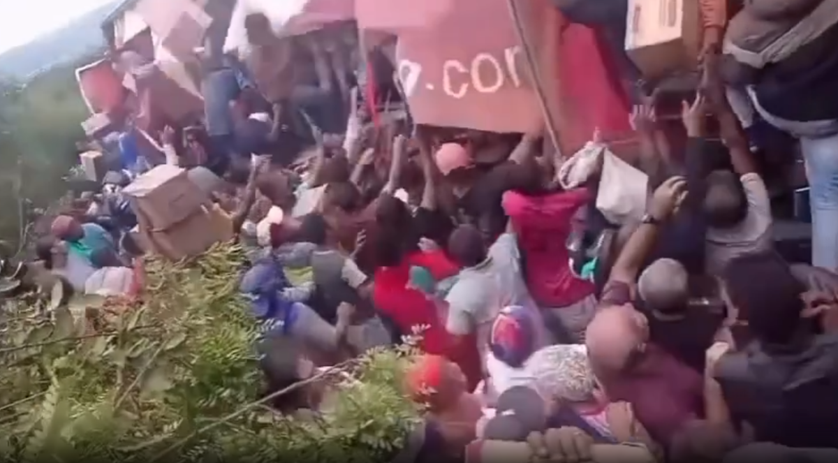 Cena de saque após tombamento de carreta na BR-116: dezenas de pessoas retiram carga exposta em vegetação. Imagem: Redes Sociais