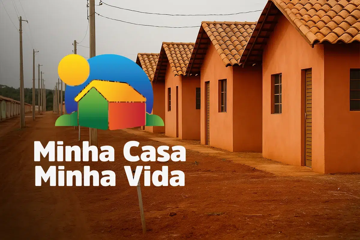 Conjunto habitacional com casas cor bege, telhado cerâmico e logo oficial do Minha Casa Minha Vida