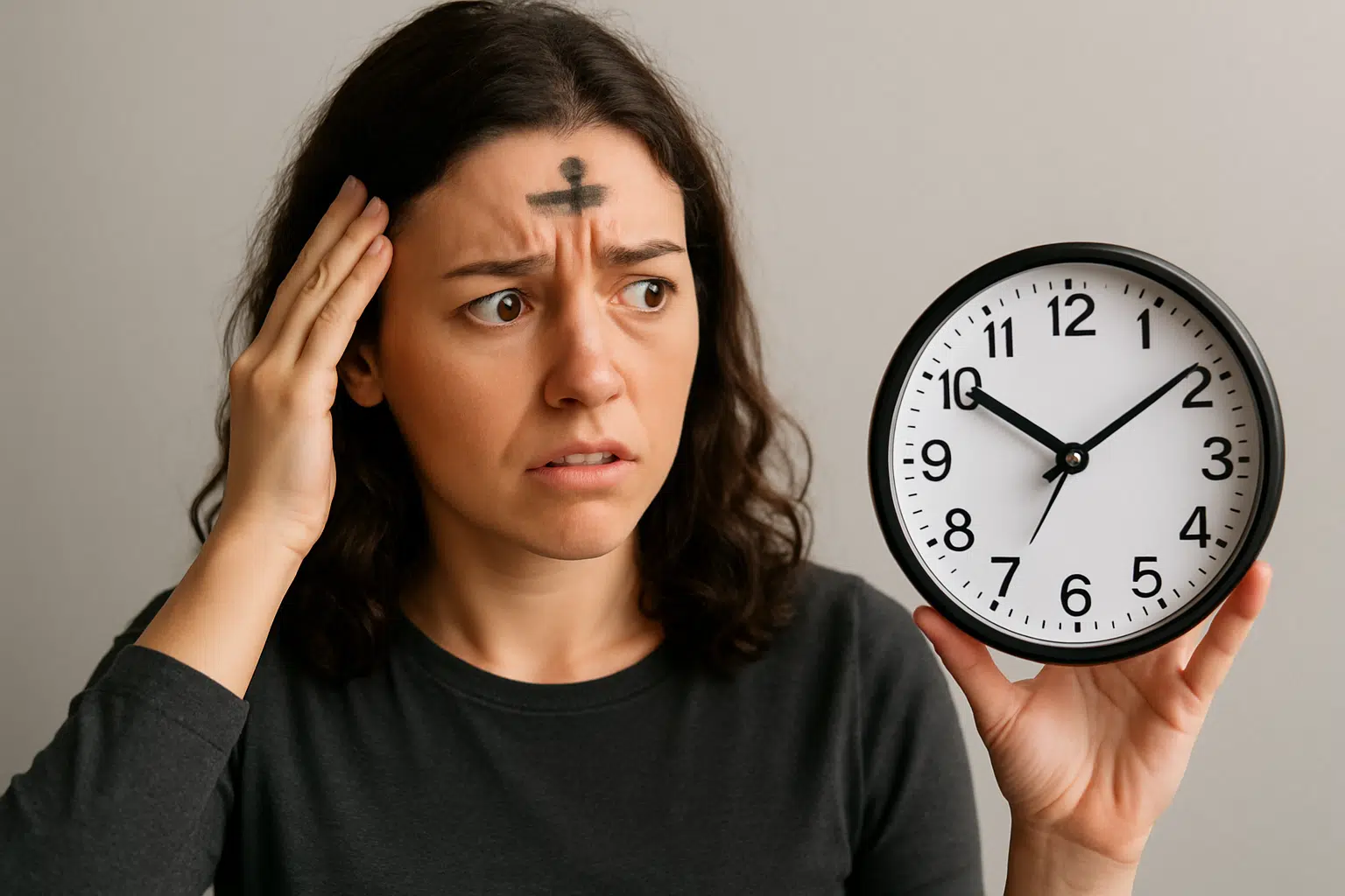 Mulher com cruz de cinzas na testa segura relógio e aparenta dúvida