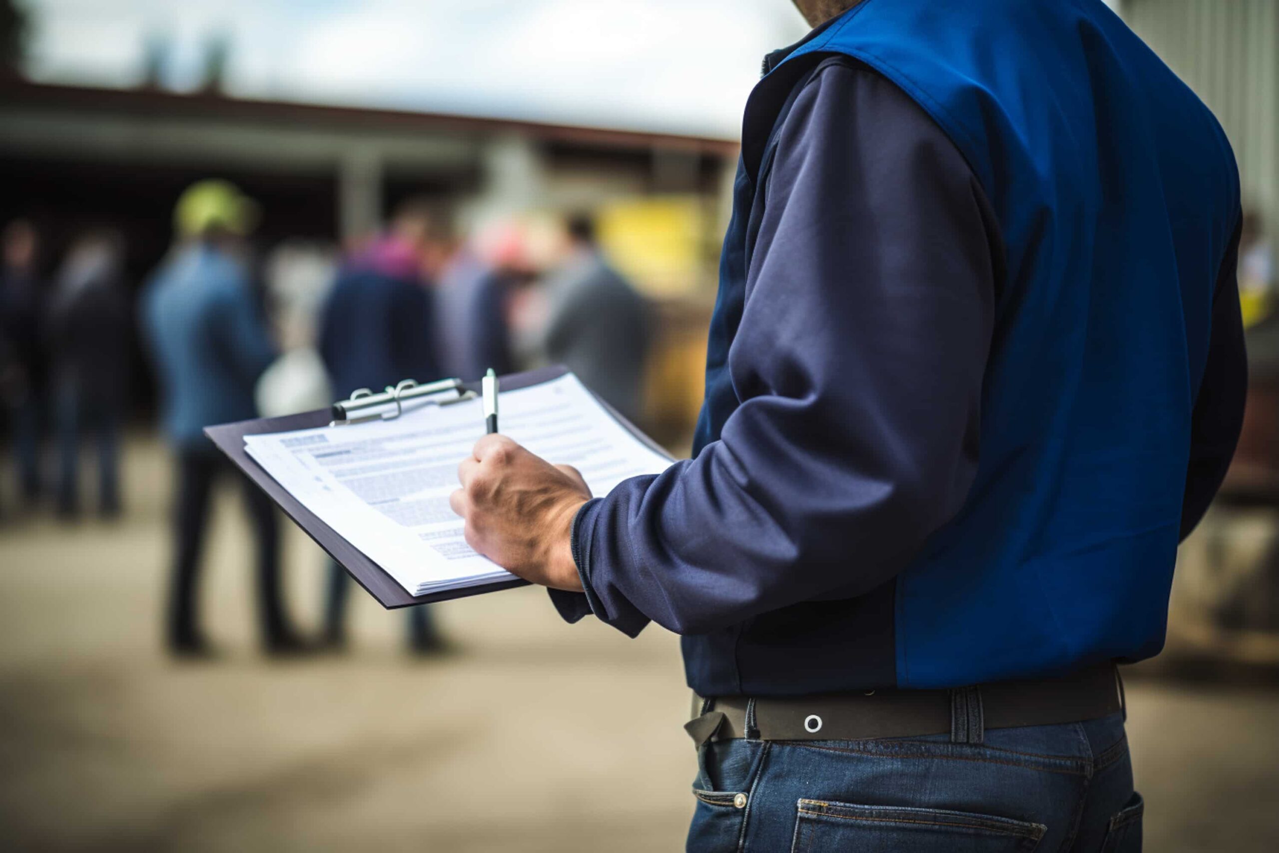 Pessoa usando colete azul escreve em prancheta durante fiscalização, grupo desfocado ao fundo